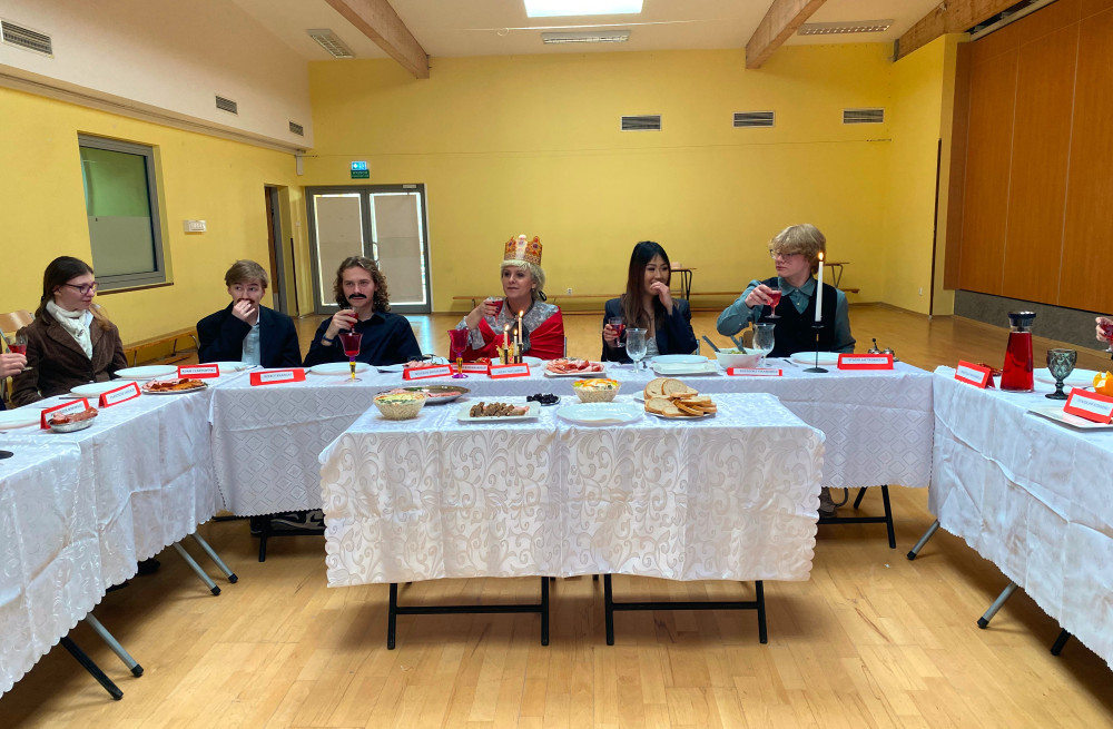 Takie motto towarzyszyło naszej niecodziennej lekcji historii w klasie 2A LO, podczas której zasiedliśmy za stołem „czwartkowego obiadu”. Weszliśmy w rolę gości króla Stanisława, gromadząc się wokół władcy w Królewskich Łazienkach. Zgodnie z przekazami historii , stół ustawiony w podkowę, zasłany białym obrusem zastawiony został jadłem i napitkiem. Główne miejsce zajął król - w tej roli nauczyciel historii p. B.Stefańska – a obok wybitni ludzie pióra, teatru, sztuk malarskich - m.in. M. Bacciarelli , Ignacy Potocki, Franciszek Zabłocki, Stanisław Bohomolec, Stanisław Konarski i Ignacy Krasicki. W ich role wcielili uczniowie klasy . Ubrani elegancko, spożywali posiłek podawany przez służbę i prowadzili z królem uczone rozmowy. Prezentowali swoje dokonania na polu kultury, a także deklamowali utwory literackie, jak choćby przesławny wiersz Święta miłości kochanej ojczyzny I. Krasickiego. Wszystko to w blasku świec i przy dźwiękach muzyki z epoki. Zgromadzona wokół władcy elita miała odmieniać oblicze szlacheckiego stanu, a w miejsce sarmackich wad promować ideał dobrego i pożytecznego obywatela, nadto światłego i nowoczesnego, miłującego Ojczyznę. Mamy przekonanie, że ta nietypowa lekcja, w którą zaangażowaliśmy wszyscy swoje siły i talenty nie tylko pozwoli lepiej zapamiętać historyczne treści, ale uświadomi ponadczasową potrzebę troski o Polskę i pracę na rzecz jej postępu.