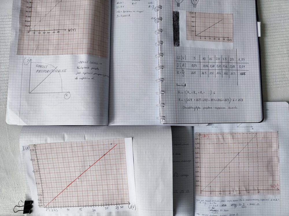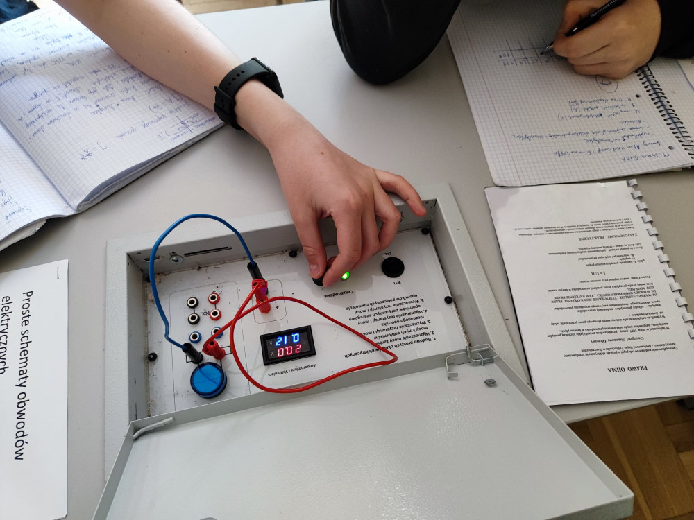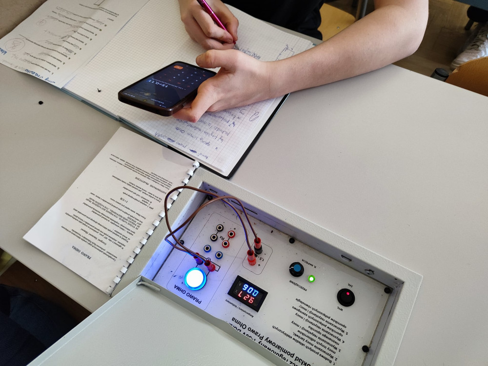 Jak co roku o tej porze uczniowie klas ósmych zgłębiają tajniki prądu elektrycznego. Korzystają ze skrzynek wbudowanych w blaty ławek, w których znajduje się obwód elektryczny umożliwiający sprawdzenie słuszności prawa Ohma. Na podstawie zmierzonych wartości napięcia i natężenia prądu rysują charakterystyki prądowo napięciowe zamontowanych w skrzynkach żarówek.