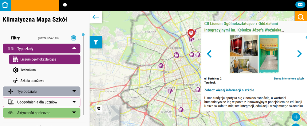 Klimatyczna Mapa Szkół to narzędzie umożliwiające filtrowanie bazy publicznych szkół ponadpodstawowych według różnych kryteriów, takich jak wyposażenie i dostępność placówki, aktywność społeczna czy oferta zajęć dodatkowych. Dzięki temu pozwala lepiej poznać „klimat” szkoły, czyli panującą w niej atmosferę i warunki nauki.